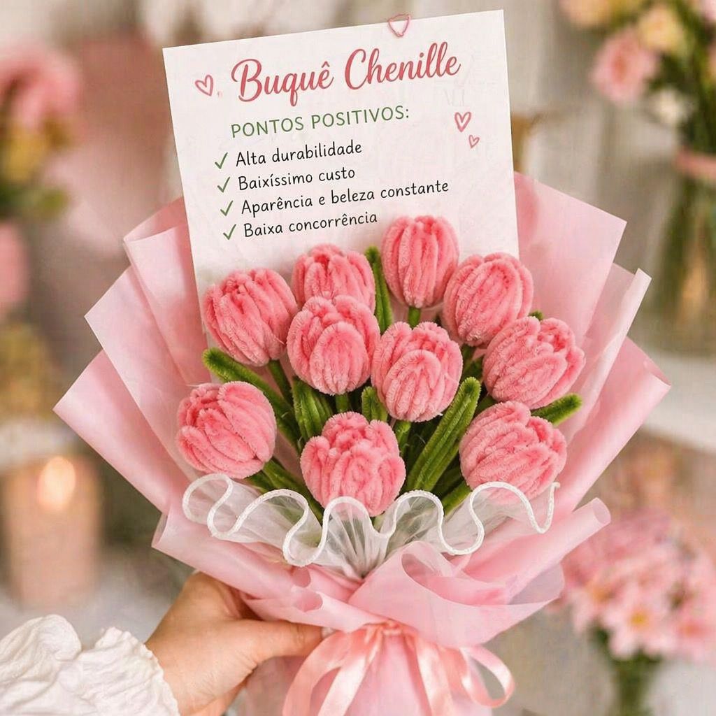 Zero. Esse é o grande diferencial do "Método Buquê Chenille Lucrativo". Se você tiver 10 minutos do seu dia você consegue criar um buquê profissional. É um trabalho manual limpo e lucrativo.